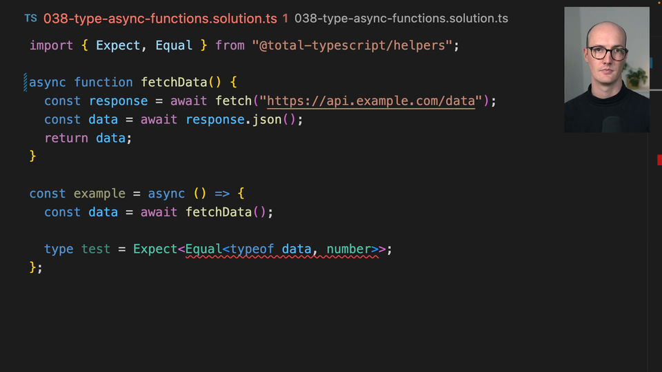 00:35 This works because data was any before, and this await response.json returns any. So now what we're doing is we're basically just putting any into a slot that requires a number, and it's happy. So that's one way to do it. The way that I recommend you do it, though, is by adding a return type to this function.
