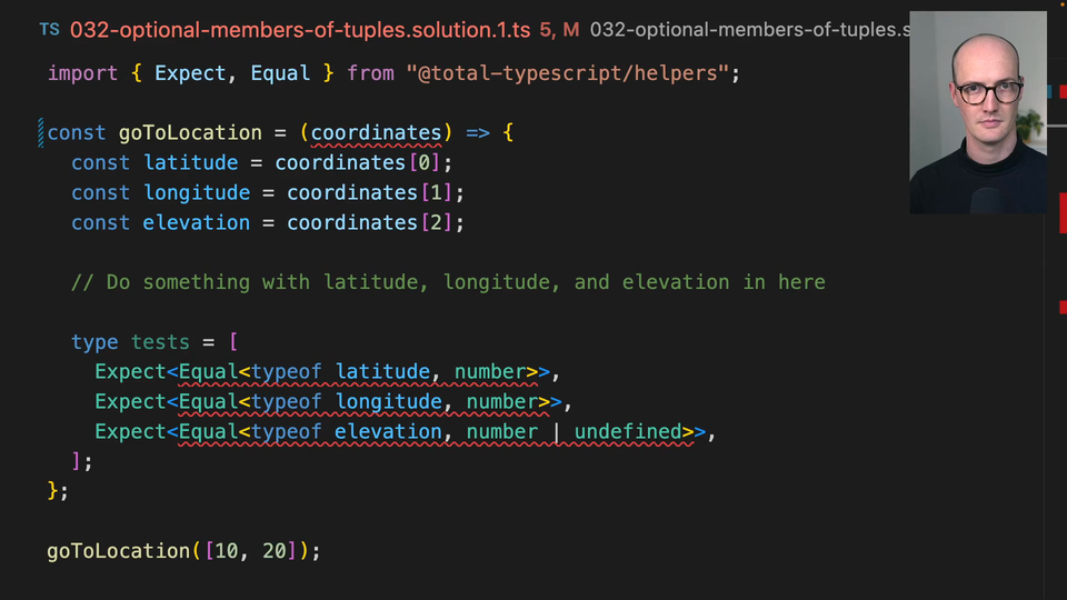 00:14 And if we go for number or undefined here, then this looks pretty good, except for you can see that go to location now, it's expecting you to pass undefined, because it's not actually an optional member of the tuple. It's just a member that's required but could be number or undefined, so the only way to