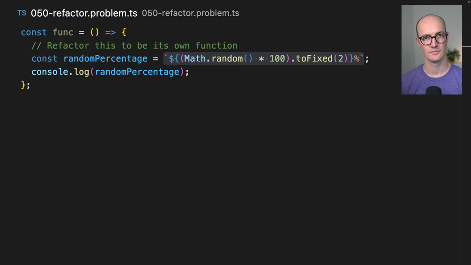 00:20 What we want to do is we want to basically take the thing that's being produced by random percentage, this little piece of logic here, and just refactor it into its own function. You might take a look and you might just sort of like have a little poke around with the stuff that's like available in your quick fix.