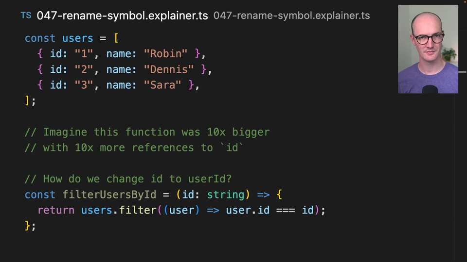 00:00 Let's look at another really beautiful little thing that you can use in VS Code and lots of other IDs too, which is RenameSymbol. Here we have a function called filterUsersByID, which takes in an ID of string. Then we filter over these users with user, user.id equals ID.