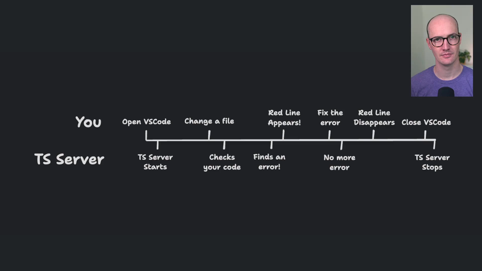 00:00 Let's talk about how TypeScript works when you're in your IDE. You can think of two people looking at your code whenever you're writing TypeScript code. You've got you and you've got the TypeScript server. Now, you're both running on VS Code, let's say. This can happen in any IDE, but I'm going to use VS Code as the primary example