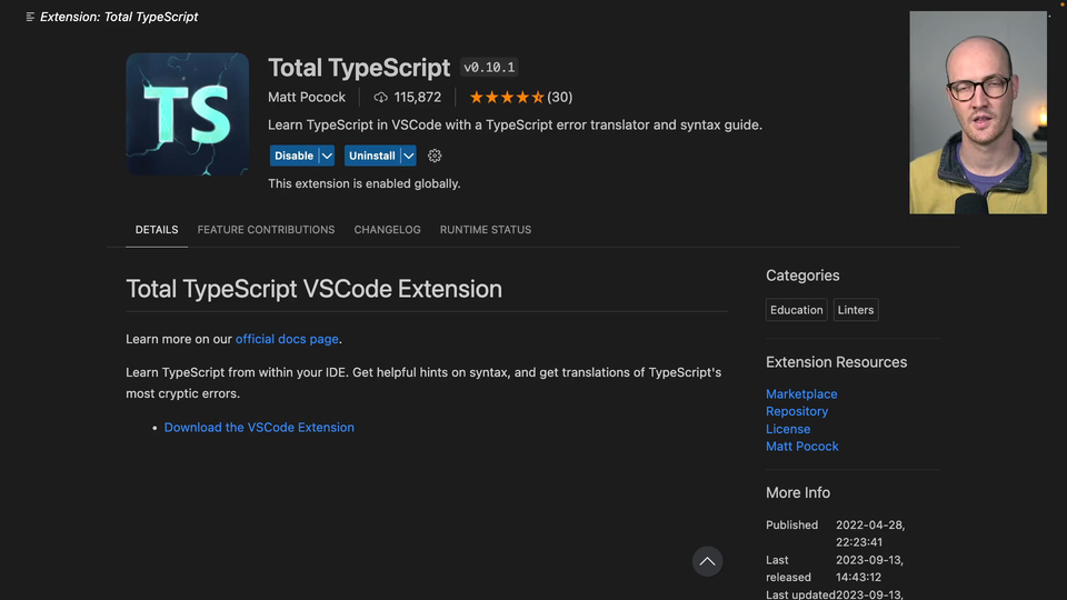 Before we continue, it's a good idea to install the Total Typescript VS Code extension. This extension provides helpful hints on syntax and error translation, making it easier to learn TypeScript.
