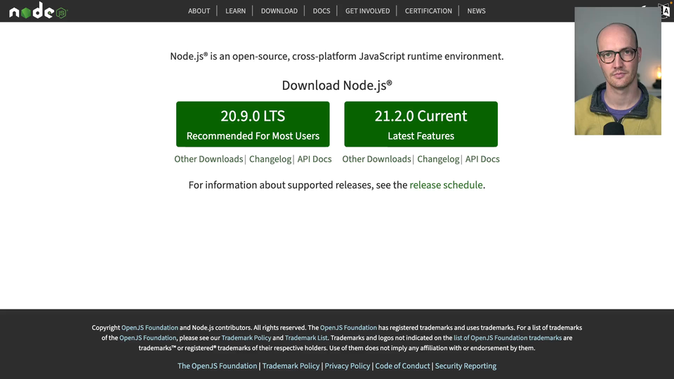 00:00 The first thing that you'll need to install is Node.js. And on here, on the Node.js site, which I will link below, you've got two buttons. You can either download the LTS, doesn't matter about the version number if you're seeing this in the future, the version number may have changed, but as long as you're on the LTS should be fine. So we've got the LTS on the left-hand side
