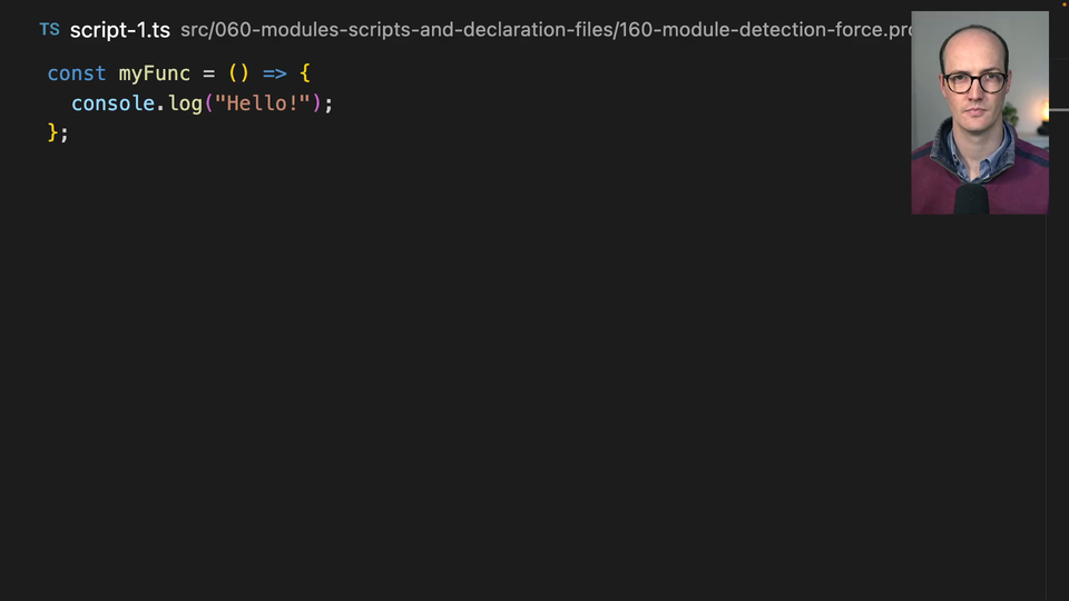 00:00 In general, in your front-end applications, you're gonna be using modules and not scripts. So it would be really good if there was a way to tell TypeScript that everything I do inside this project is a module, not a script. And if I have an accidental script here, let's say I have a script one file and a script two file, it would be great if I could get an error saying