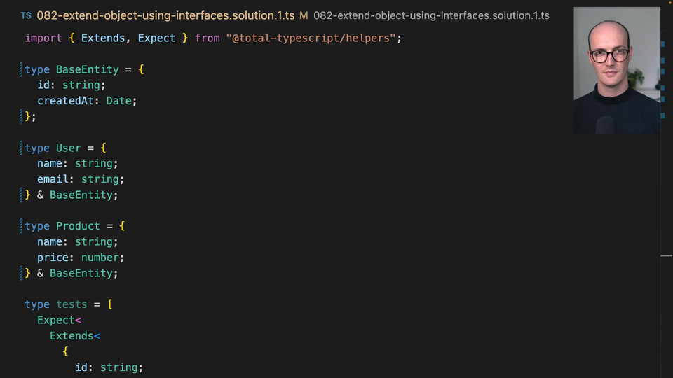 Instead of using the type keyword, the BaseEntity, User, and Product, can be declared as interfaces. Note that interfaces do not use an equals sign like type does: