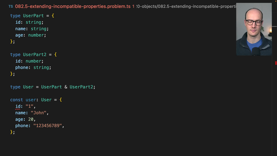 00:00 In this exercise we have a pair of types here. We have user parts and user part two. These happen to have a couple of incompatible properties here. So it has a user ID string on user part one and ID number on user parts two.