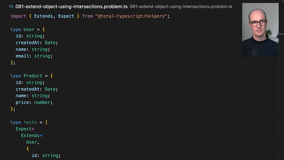 01:17 we might want to extend this into a reusable type that we could intersect with both of these types to kind of get it working. We have some tests here that are testing to make sure that user and product stay in the correct shape here. But what I'd like you to do is change the definition for user and product so that