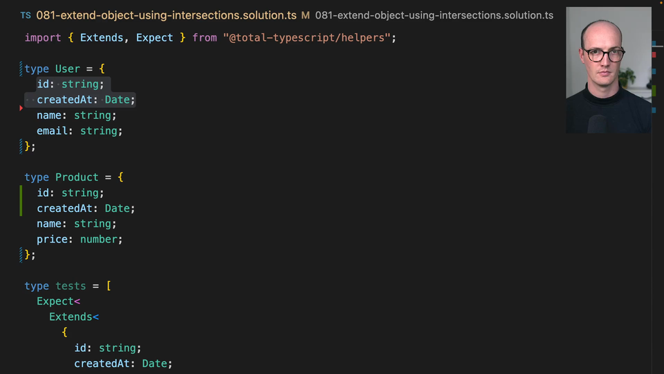 00:00 Okay, let's take the properties that we have in common between user product and create a new type from them type base entity is now ID and created at we now have an error down the bottom, of course, because user no longer corresponds to the contract that we want it to, but if we give it an intersection and we say and base entity, then it starts working.