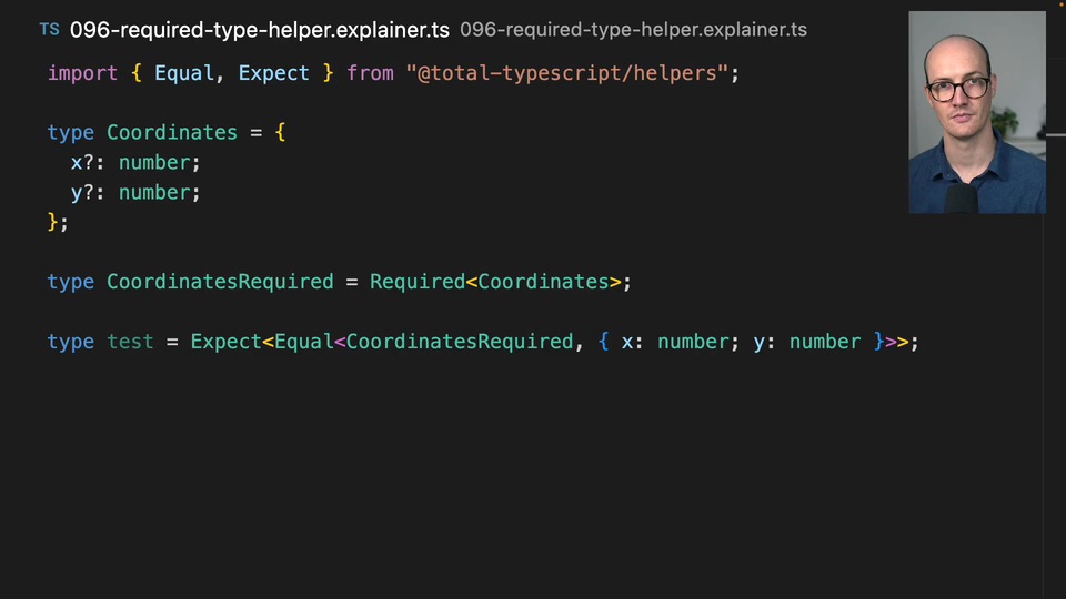 00:00 The opposite type helper to partial is required. So instead of making a partial of a type, this makes all of the elements required. Super useful. So coordinates here, we can see that X and Y are both number or undefined and required after being applied to it, turns them into X number and Y number. So both required. And that's really, really nice.