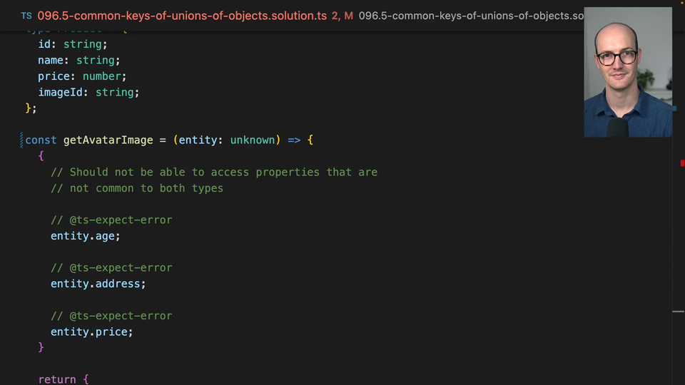 00:41 It's just that it's not available on all of the members. And TypeScript will yell at you if you don't get that right. So this means then this is kind of like a narrowing thing, really. We would have to say now if age in entity, then we would know that it's an entity.age. So we'd know that this is a user, for instance.