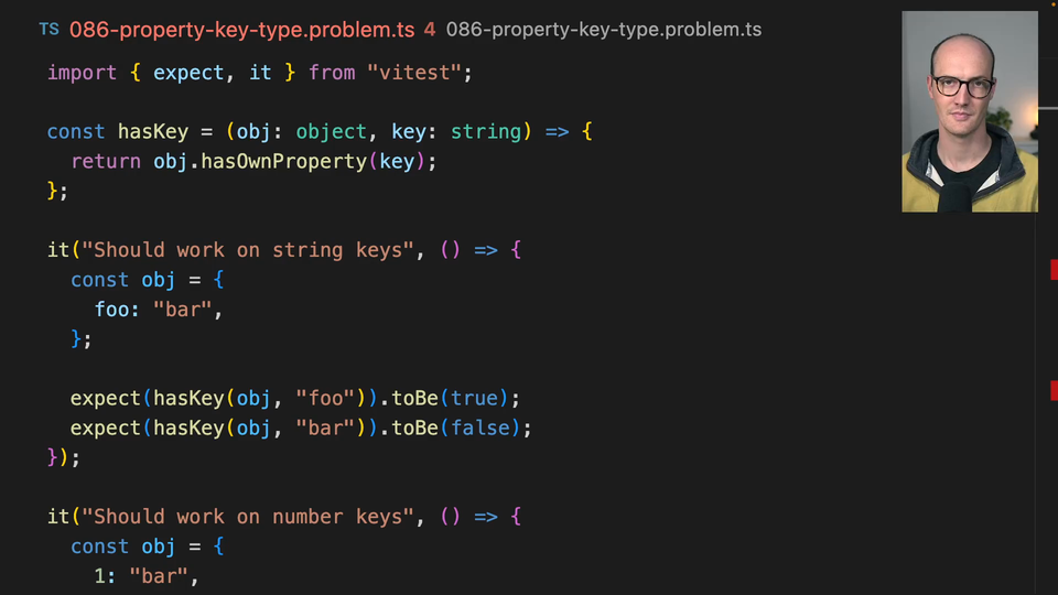 00:00 In this exercise we have a hasKey function that takes in an object and then also takes in a key. Then it calls object.hasOwnPropertyKey on that object. Cool, simple enough. So it's kind of like an abstraction over hasOwnProperty. It's a little not particularly useful, this function,