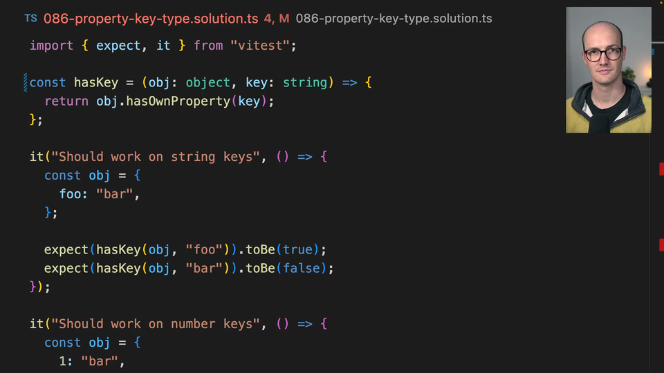 00:19 Well, we can use, if we hover over this, we can see that object.hasOwnProperty, if we command click on it, it takes in a type of property key. And property key is a globally available type, available in any version after ES5. So we can use property key inside here. So key now takes property key.