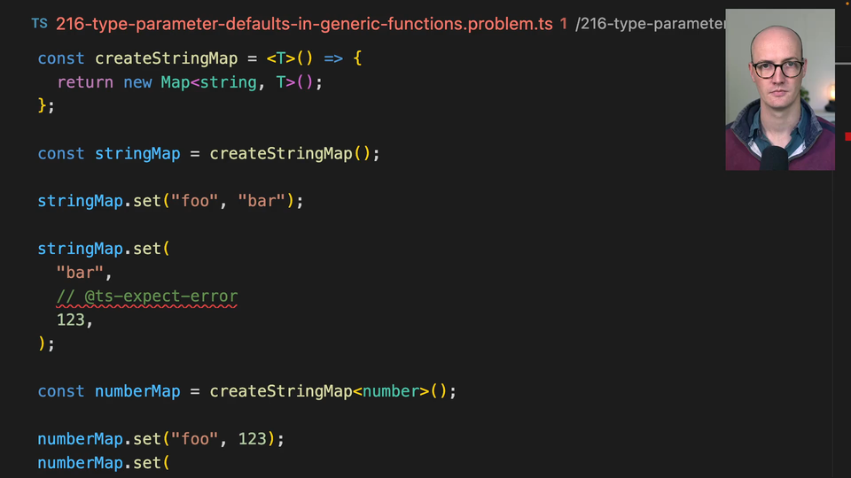 00:18 and currently map is mapString unknown. But actually, if we don't pass in a value for T, we want to default it. We want it to default to string. So if we don't pass in anything here, down here we're passing a number, down here we're passing a number, still working as before. But if we don't pass in anything,
