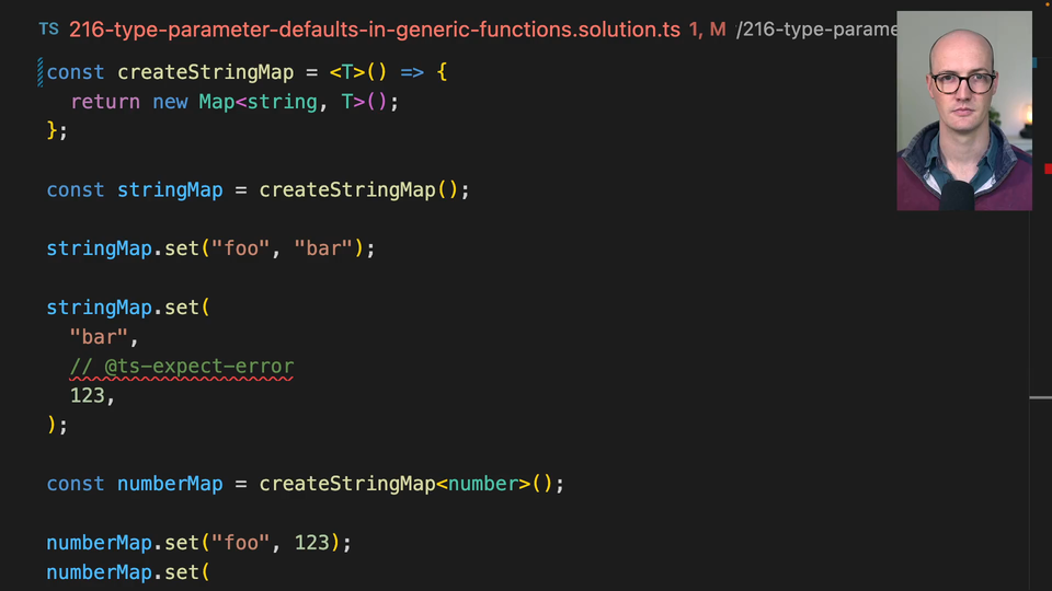 00:00 So the syntax is actually exactly the same as we saw in generic types. This T here, we can say equals string. And now if we don't pass in a value for createStringMap here, it defaults to string, if we don't pass in a type argument. There we go, beautiful. So now we have mapString string.