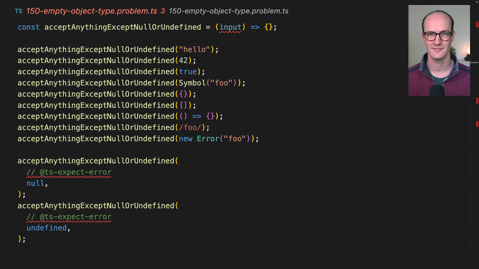 00:32 but error if we pass it null or undefined. This is a quite a hard type to define, and when you find the definition, your brain's going to explode. I think it's extremely simple, and it's very key to understanding some of the deeper parts of TypeScript. I will link to an article below that explains more about it. Good luck!