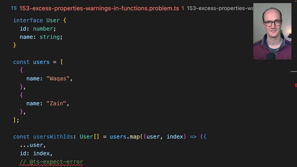 00:00 Let's look at another example where access property warnings don't trigger. We have an interface of user with ID and name, and then we have some users here, which is an array of just names, so Vacas and Zayin. Now, when we say users with IDs, we're assigning that variable to a type of user.
