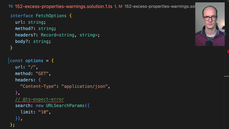 00:57 actually TypeScript by default doesn't check. Now it will check them if you do a few different things. So if you say options, let's say it is give the variable a type of fetch options. Now it's going to check and it's going to say you added an excess property in this position.