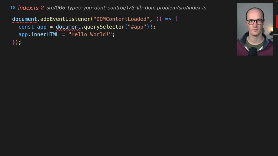 document.addEventListener("DOMContentLoaded", () => { // red squiggly line under document const app = document.querySelector("#app")!; // red squiggly line under document app.innerHTML = "Hello World!";});