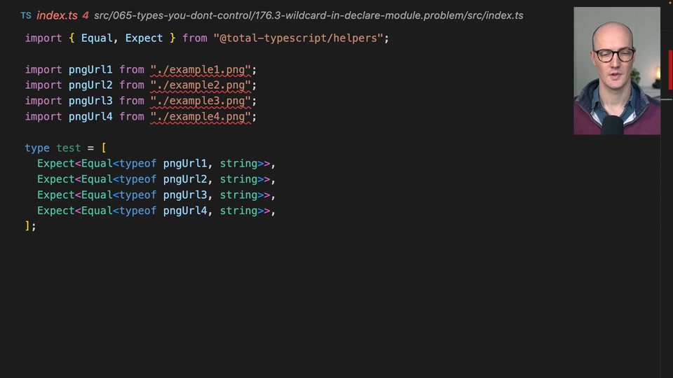 00:00 In this exercise, we're importing a bunch of PNG files. And normally, PNG files are not kind of recognized by TypeScript. They don't know what they are. And so we need to say that whenever we import a PNG, it's going to be of type string. This is really useful in environments like Webpack, for instance,
