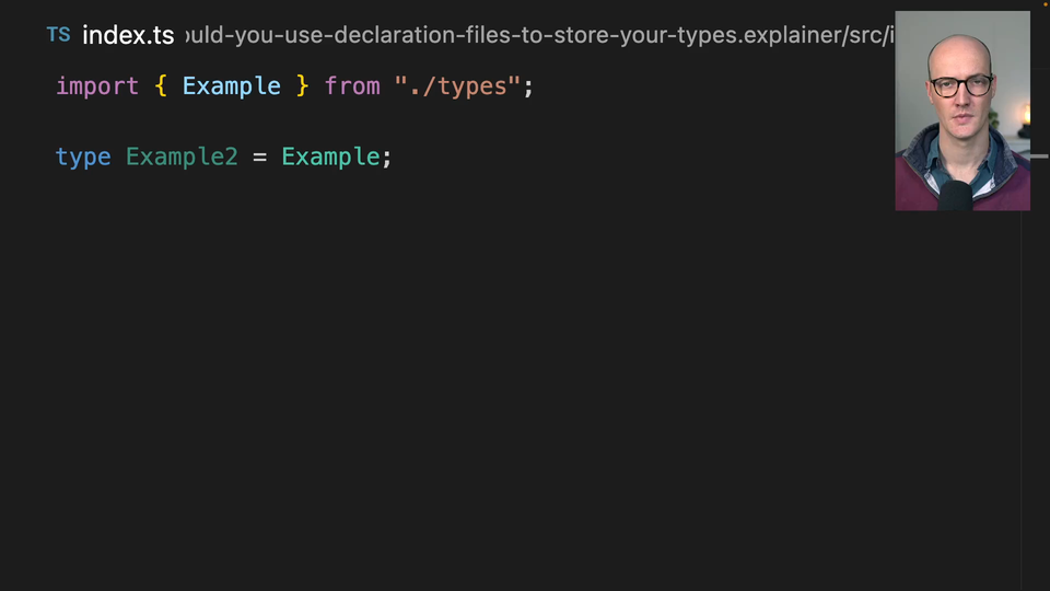 00:00 A common pattern that I see a lot in TypeScript and TypeScript repos out in the wild is that people look at the .d.ts file extension and they think, ah, this is where I should put all of my types. So I should have two different files. I should have index.ts on the left