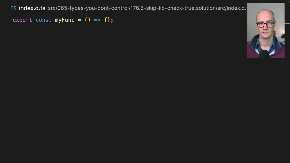 00:00 Okay, the option here is skip lib check. I have turned this to true. And what this means is if we go back to our index.t.ts over here, we can see that if I comment this out or actually just set it to false here, then my index.t.ts file is going to start erroring again.