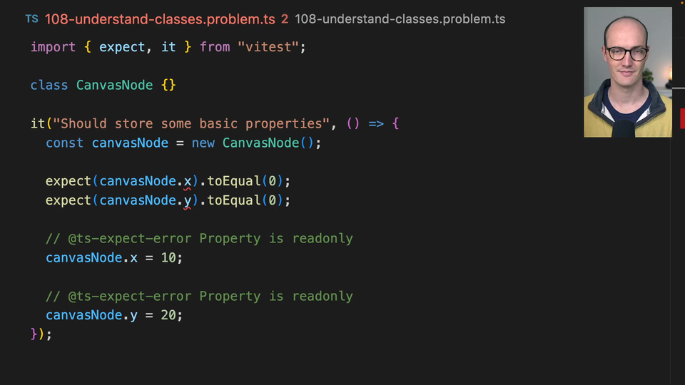 00:00 In this exercise, we have a class called CanvasNode, which is currently acting like an empty object. We can initiate CanvasNode like this by calling new CanvasNode on it. And currently we're expecting it to have two properties on that class. We're expecting it to have a property of X, which is gonna be zero,