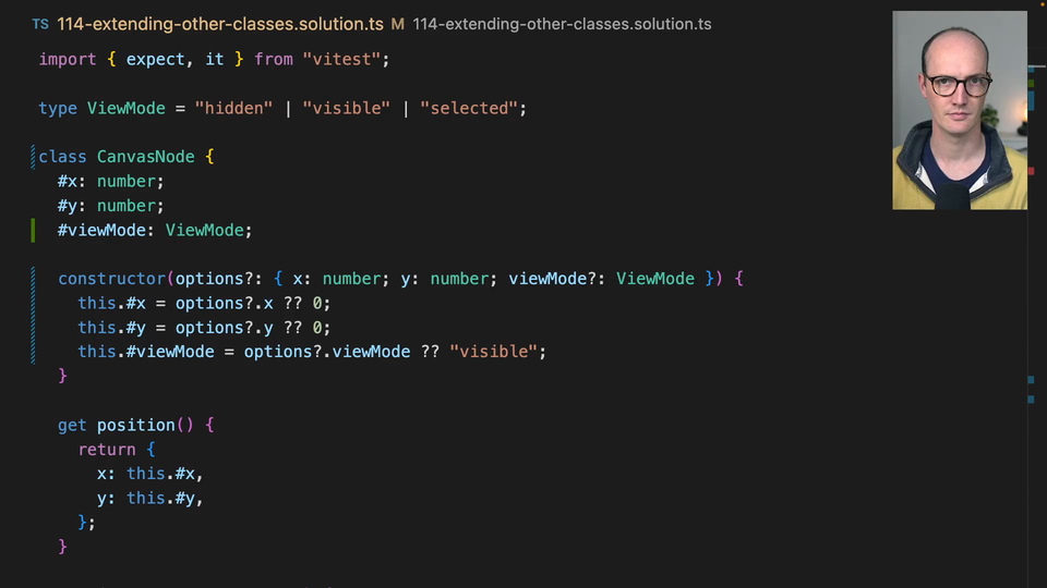 00:54 So we need to find a way to make this CanvasNode extend or inherit from the Shape and add in a bunch of Shape properties. So let's say CanvasNode extends Shape. And similar to interfaces, this means that CanvasNode now inherits all the properties and methods of Shape.