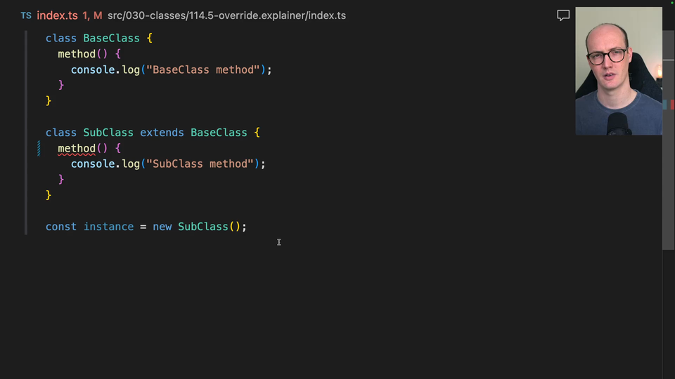 00:18 it would say base class on it, but we extend the base class in our subclass and then we declare method again. And we say console log subclass method. So we have instance down here. And when we say instance dot method, it will actually call the subclass version because we're overriding it.