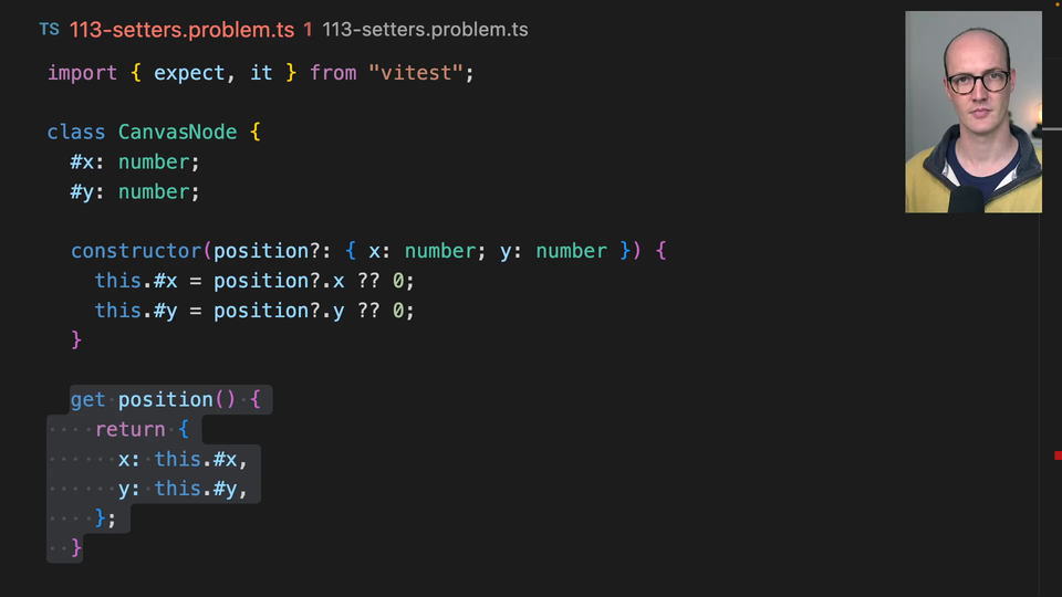 00:00 We're back with our canvas node. We've got our read-only properties with our hash. We have a constructor, we have a get position, and we have a move function. We now have a new requirement where we want to be able to modify the position from outside directly. Now this is an issue because if we hover over this,