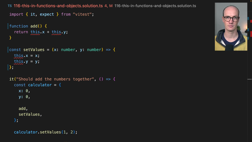 00:34 to pass in any numbers. It's just using the context of this to get it working. But what about this error? Object is possibly undefined. What on earth could that error mean? And why actually, is this whole thing breaking down the bottom? Why isn't this working? Let me