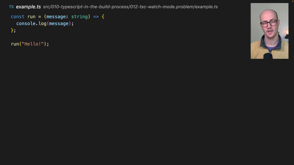 00:00 In this exercise, we're starting from where we left off from the previous exercise. But this one, we're trying to make our development process a bit better. The way it's currently working is we're basically having to every time we make a change inside here, we're having to run TSC in order to get the new JavaScript file out.
