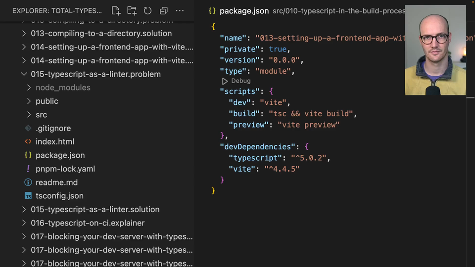 00:38 So your job here is to work out why this is happening and to go first of all into the tsconfig.json. This was generated for us by VEET, and your job is to work out which of these config options could possibly be causing TypeScript to not emit any JavaScript