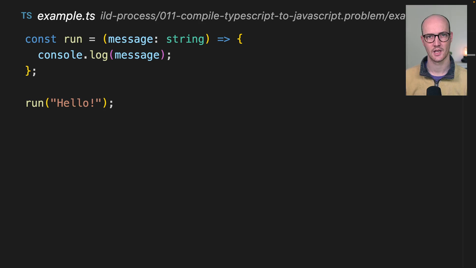 00:32 Then we're going to need to essentially say, right, let's initiate a TypeScript config inside here. Then we're going to use that TypeScript config and the TypeScript CLI to turn this TypeScript file into a JavaScript file. There are a few steps to set up here.