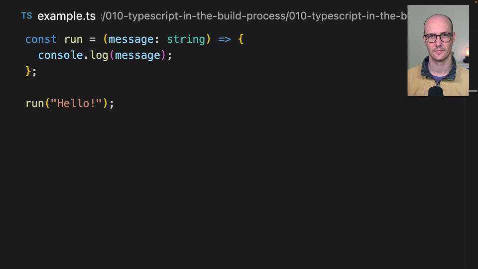 00:00 The reason this wasn't working is that browsers can't understand TypeScript syntax itself. So we have a const run function here with message colon string. And this colon string is actually just not available in JavaScript. Browsers understand JavaScript, not TypeScript.