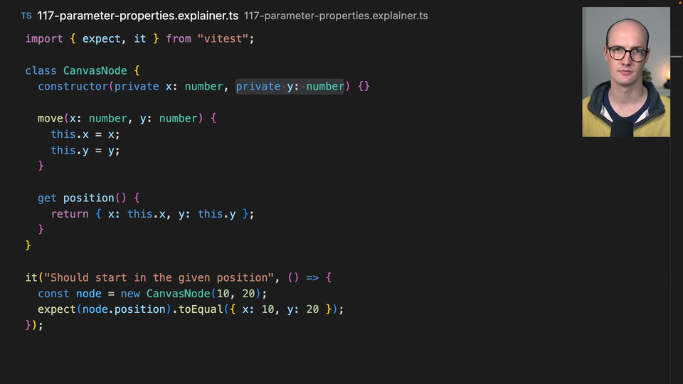 00:00 We're going to start by looking at parameter properties in TypeScript. Here we have a CanvasNode class, which has a move function and a position getter. And it has a constructor, and that constructor has two parameters, has x and y, both of which are numbers.