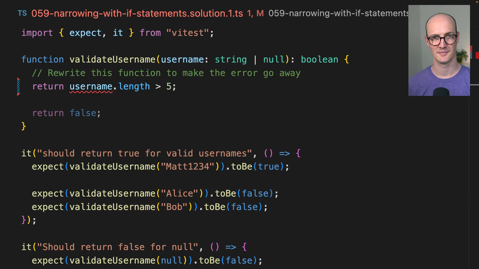 00:50 So this is the first way of doing it. We'd also do it by checking if type of username is a string, and if it is, then do it that way. Beautiful. Otherwise, we could also check if type of username is not a string, because if type of username is not a string, then username inside here is going to be null and we can return false,