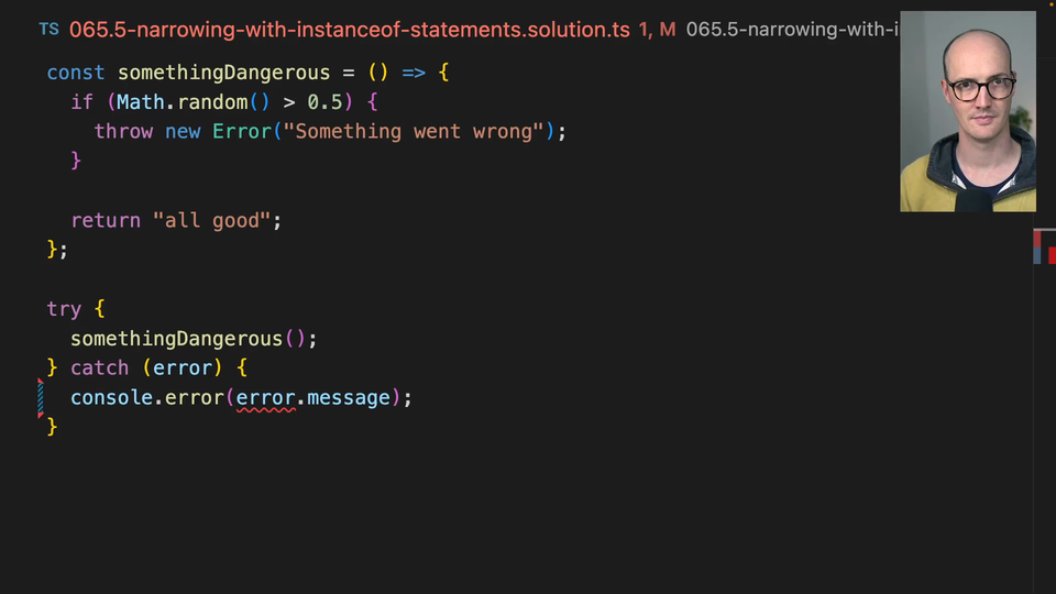 00:57 Error or sorry if error instance of error Boom everything's now working So it's using the instance of operator which compares whether this error Variable is an instance of and I'm pretty sure that works. Even if this was like a type error or something like that