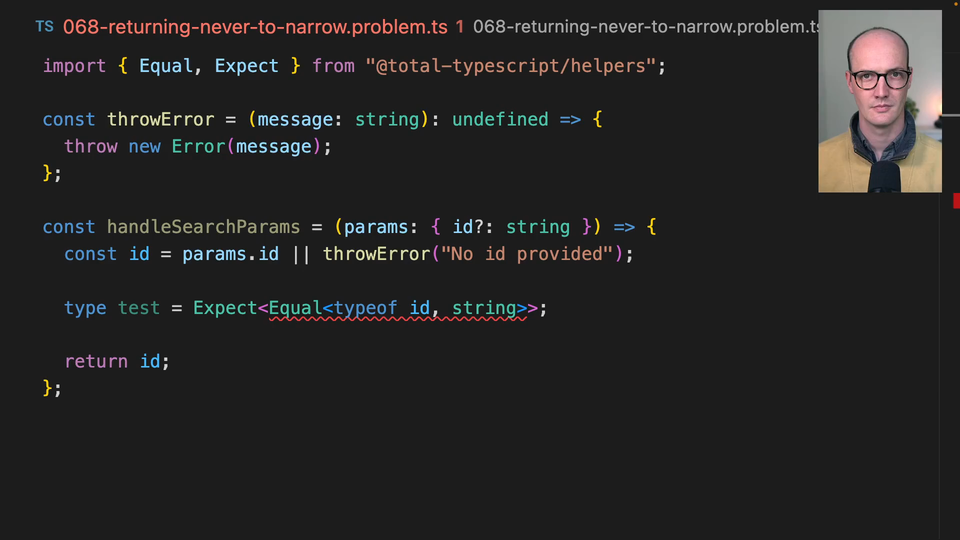 01:07 So in theory, this id here should be just string instead of string or undefined. So your job actually is not to change any of the code inside handleSearchParams, it's to change some code inside throwError, inside this function here. And see what you can come up with,