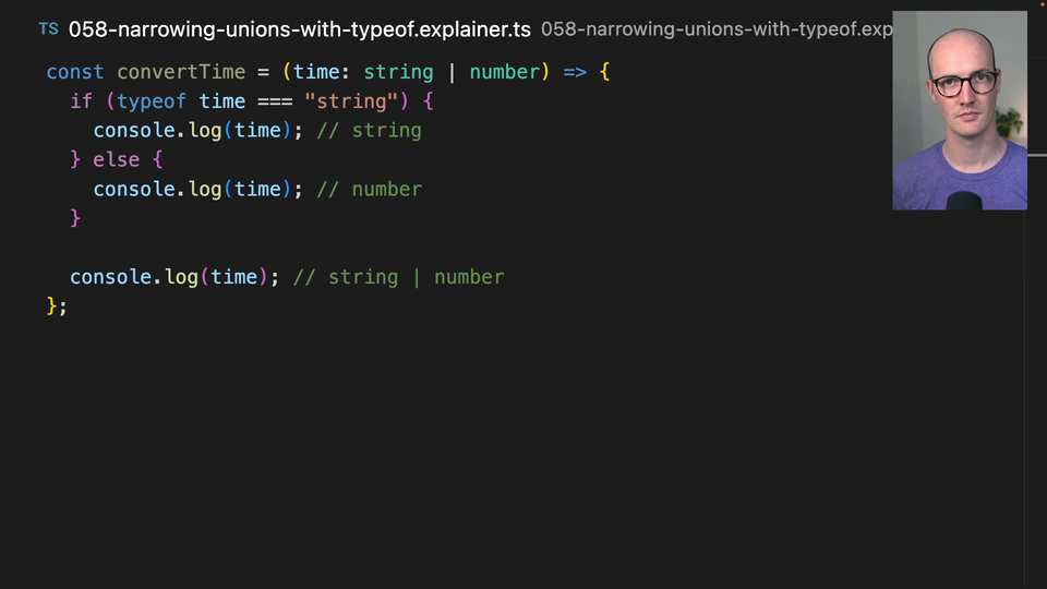 00:00 Now that we know about union types, it's time to introduce one of TypeScript's most powerful features, and that's narrowing. So here we have a convert time function, and the convert time function takes in a parameter of time, which is string or number, and we have an if statement here. The if statement checks if type of time is string,