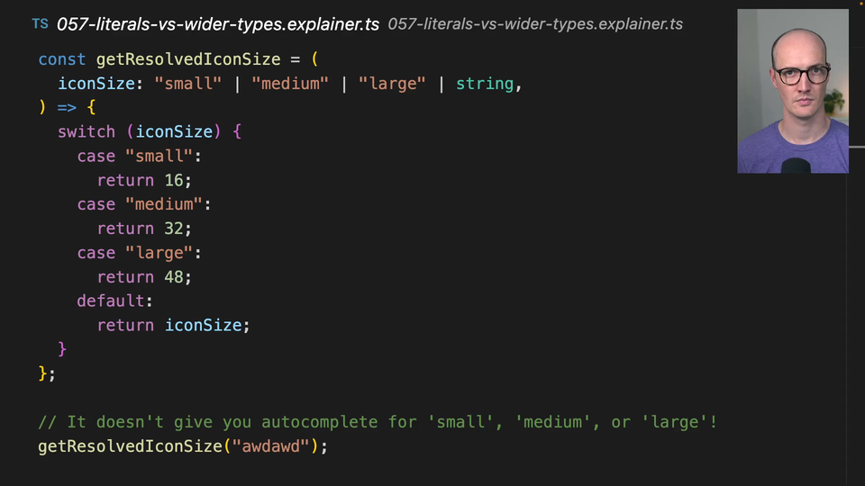 00:00 Let's talk a little bit about how literal types resolve with wider types. You can see here that we have a GetResolvedIconSize function, which is taking in an icon size parameter of either small, medium, large or string. This means that if you pass in small, it's going to return 16.